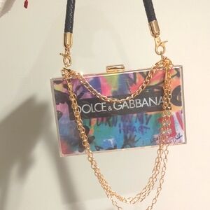 This exquisite super Rare Dolce Gabbana X Guzzini 2023 graffiti Paper Shopping Bag upcycled and repurposed into a wearable acrylic clutch that showcases a luxurious gold finish, complemented by branded print that makes a bold statement. The compact design is perfect for carrying essentials, while the gold hardware adds a touch of elegance. Ideal for special occasions, this clutch is a testament to refined style and sophistication.