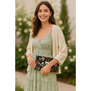 KELLY & KATIE BLACK FLORAL CLUTCH CROSSBODY PURSE W/ GOLD PLATED CHAIN STRAP