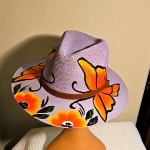 Elevate your style with this beautifully handpainted Panama hat featuring vibrant floral and butterfly designs. The perfect Summer accessory to add a pop of color to any outfit.