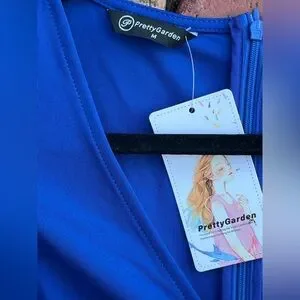 This elegant dress features a vibrant blue hue with a flattering fit and flare silhouette, perfect for wedding guests. The wrap-style bodice is complemented by a V-neckline and flutter sleeves, adding a touch of sophistication to the overall design.