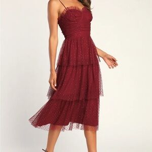This elegant burgundy dress features a tiered design with delicate detailing. Only worn once, in great shape!