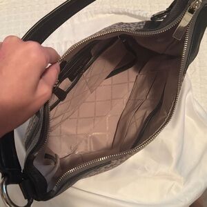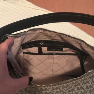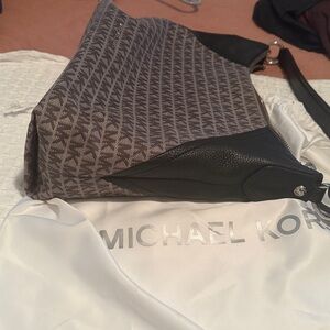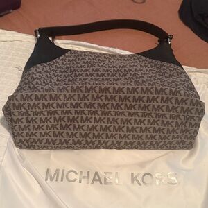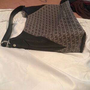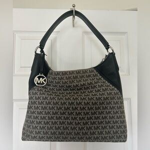 This elegant Michael Kors shoulder bag features a sophisticated black and gray color scheme, adorned with the iconic MK monogram. Its structured design is complemented by sleek black leather trim and handles, offering a chic and versatile accessory for any occasion.