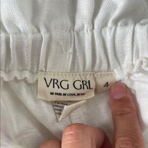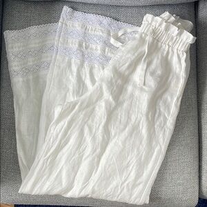 Gorgeous full length white 100% linen pants with lace detailing at the trim of the pant leg. Features an elastic waistband all around and ties in the front. Perfect for a coastal bride at her bachelorette or even just a summer date day/night! These pants are so comfortable and flattering. I’m only selling because they were too small on me. I would say they fit more like a size 2 although the waistband does give the waist a bit of stretch.