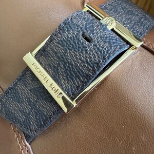 Michael Kors leather boots, over the knee. Gold buckle, monogram strap, very soft. Lug soles.