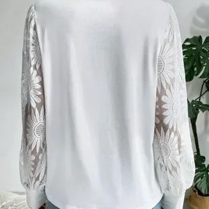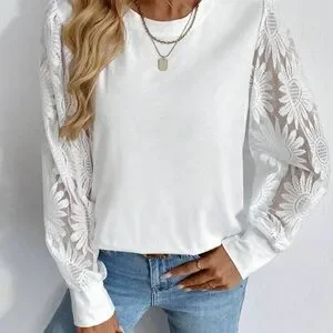 This elegant white top features beautiful lace sleeves, perfect for adding a touch of sophistication to any outfit. Ideal for both casual and formal occasions.