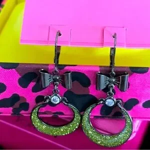 Charming earrings with green glitter hoops. Gunmetal bow accents. Perfect for adding some retro sparkle.💖