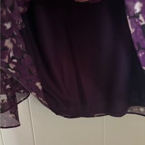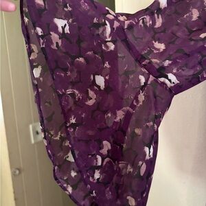 Elegant purple blouse with floral pattern. Flowy sleeves add charm. Ideal for versatile styling.