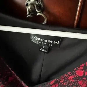 Stylish black and red print dress with short sleeves and made of polyester fabric. Features a flattering design with gathered waist. Ideal for various dressy occasions. Made by Connected Apparel size 8 and in excellent condition.