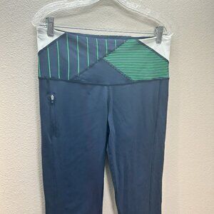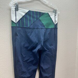 Stylish navy leggings with green striped waistband. Comfortable and flexible fit. Perfect for workouts or casual wear. These leggings are tall - best for heights 5’10” or taller.
