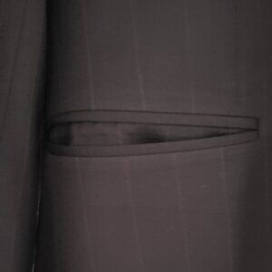 Chaps dark brown pinstripe suit. Both pieces are 100% wool and lined with 100% acetate. Jacket: pit to pit = 18.5". Jacket length = 26.5" shoulder to bottom of hem. Pants: waist measures 17" side to side. Pants length is 42.6" from top of waistband to bottom of hem. Very gently used - no tears, rips or flaws.