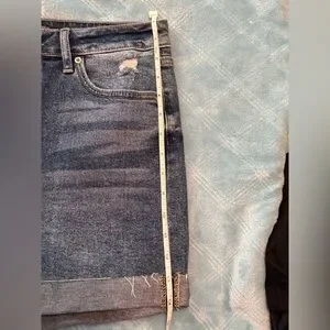 These blue jean shorts from Just USA feature a high-waisted design with a classic distressed look. The medium-dark wash and rolled hems offer a casual summer vibe, while the intentional fading and wear patterns give them a vintage appeal.