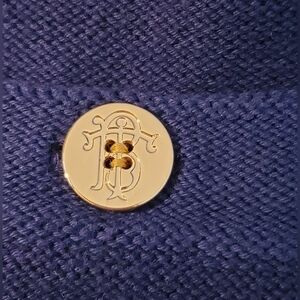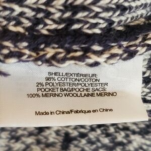 It is a navy and white/gray striped sweater with a boat neck, 3/4 sleeves, and two small pockets on the front with gold toned monogrammed button details. The material is a knit of Cotton, Polyester and Merino Wool.