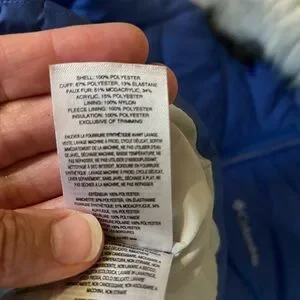 Columbia jacket in a pretty blue. Features a detachable faux fur trim on the hood. Size is. Medium which fits like a 10/12. It is fitted through the bodice. No stains or tears and very little wear on the arm cuffs. Two side pockets. Ideal for cold weather.