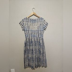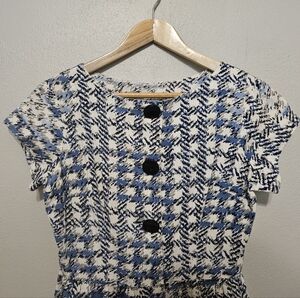 This vintage handmade dress has a classic 1950s/60s silhouette, featuring a full pleated skirt, large front buttons, and a bold blue/white abstract print. This dress is lightweight with a cotten feel and perfect for summer. Button-up style in front with extra small snap buttons at neckline and waist.