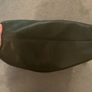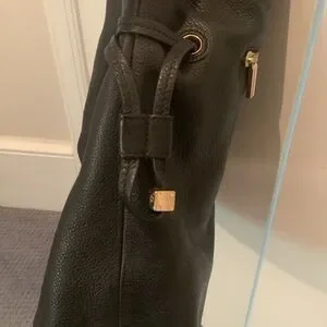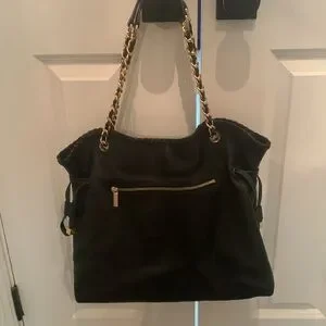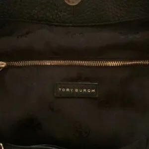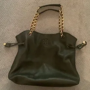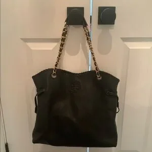 Stylish Tory Burch slouch leather shoulder bag. Features black leather and gold chain straps. Interior black Tory Burch fabric with snap closure. Like new condition.
