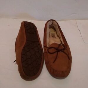UGG Australia Brown Leather suede signature slippers loafersBrown and beige slip-on slippers loafers size 9.cozy brown suede moccasin slippers with a soft lining and bow detail.