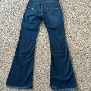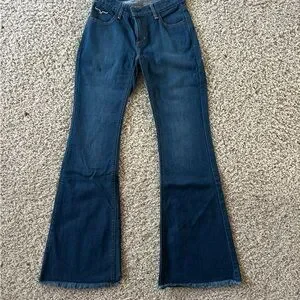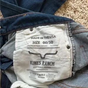 These Kimes Ranch jeans feature a classic blue hue with a stylish flare and wide leg design, offering a timeless 1970s-inspired silhouette. Crafted from durable denim, they provide a comfortable fit and a clean, polished look. NEVER WORN JUST TRIED ON!