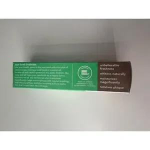 The box lists ingredients and features such as being vegan, whitening, moisturizing, and plaque-removing.