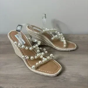 NWOT Steve Madden Upright Vinyl Pearl Studded Strappy Espadrille Wedges Size 7.5