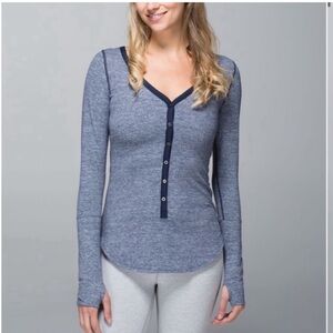 Lululemon Awesoma Henley long sleeve top in heathered Inkwell. No size tag but is a size 8. In excellent condition.