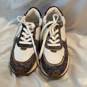 Trendy sneakers featuring a white base with black and red accents. Perfect for casual wear.