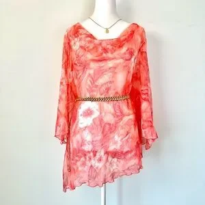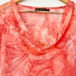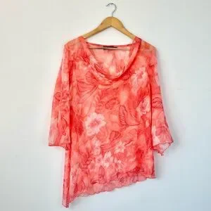 Vintage Picadilly Orange and Pink Floral Asymmetrical Sheer Blouse 3/4 Sleeves