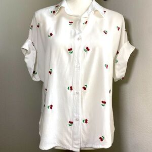 Cherry Embroidered White Button Down Collared Short Sleeve Shirt