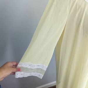 Soft yellow robe with elegant lace trim. Perfect for lounging.