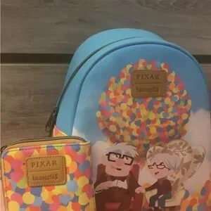 This delightful Loungefly bag set features a whimsical design inspired by the iconic balloon house scene from the movie 'Up'. The accessories are primarily blue, showcasing a vibrant cluster of colorful balloons lifting a house. Perfect for fans of the film, this coordinated set includes a standard-sized backpack and a matching smaller case, both crafted with attention to detail and style.