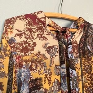 Stylish floral patchwork dress with long sleeves. Features a mix of red, yellow, and blue patterns.