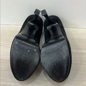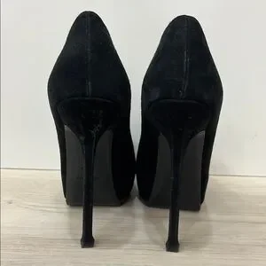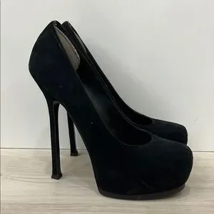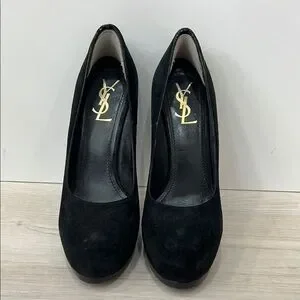 These Yves Saint Laurent heels feature a classic black suede finish with a sophisticated rounded toe design. The moderate to high heel height makes them ideal for both formal and professional settings, while the iconic YSL gold logo on the insole adds a touch of luxury.