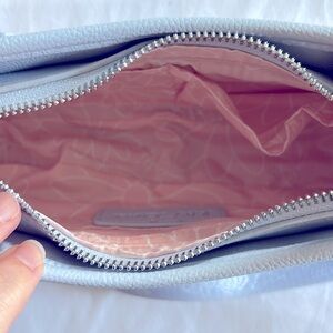 This bag is SO CUTE! Tag says the color is “blue”. It’s more of a periwinkle color with a coral pink inside and features. Very cute! Comes with a keychain. Has two pockets and a zipper pocket inside. Can use as a handbag or over the shoulder with adjustable strap. Comes from a smoke free home!