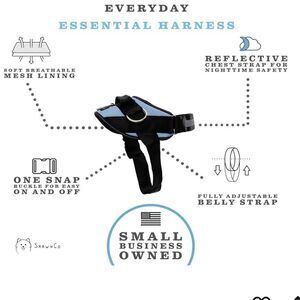 The SHAWN Co Essential Dog Harness is a non-pull, soft/vest harness designed for small dogs in size XS. Made from canvas mesh material, it includes 3 leash clips for added versatility, a padded interior for comfort, and reflective elements for increased visibility. This harness is adjustable to ensure a secure and comfortable fit for your furry companion.