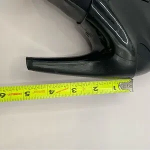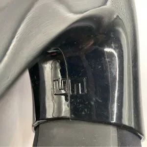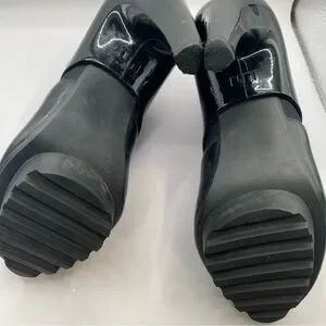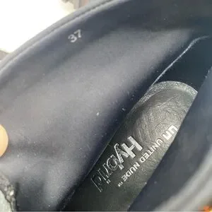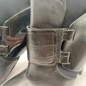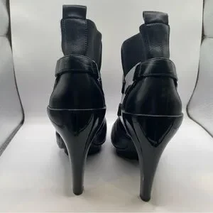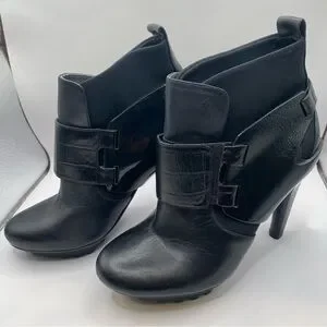 These sleek black ankle booties from United Nude feature a sophisticated design with a high heel and a unique strap detail for a modern touch. Crafted from smooth black leather with croc accents, they offer a comfortable fit with extra padding around the ankle, making them perfect for both professional and casual settings.