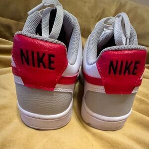 Classic Nike sneakers with vibrant red swoosh. Sleek white and gray accents. Worn before, some spots dirty, shown in pictures. Does not come in original box.