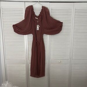 New with tags. This stunning wood rose dress features a sophisticated on or off shoulder and elegant bishop sleeves, perfect for making a statement at weddings or cocktail events. The tie front design accentuates the waist, while the flowing skirt adds a touch of grace to your ensemble.