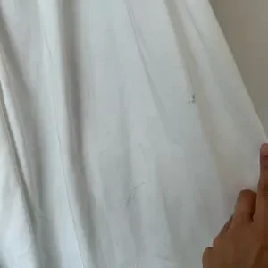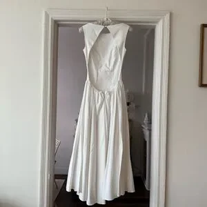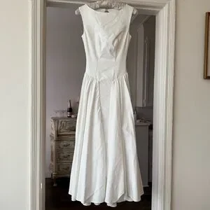 This stunning midi dress by House of CB features a pleated A-line silhouette in a crisp white hue, perfect for a bride or wedding guest. The sleeveless design and square neckline add a touch of elegance, while the structured fabric ensures a flattering fit. Small stains on the skirt.