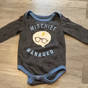 Adorable 'Mischief Managed' kids one piece in gray with blue trim. Perfect for little ones who love a touch of magic.