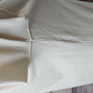 Abercrombie & Fitch Kids muscle tee, slightly off-white, long sleeve, pullover shirt tee, with outer stitching around the neck, arms, sleeve ends, and on the chest. Moose emblem at left chest and a & Fitch sewn on the outer left sleeve.