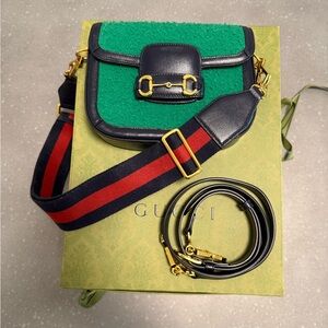 Authentic Gucci Horsebit 1955 Crossbody Bag in an amazing green wool and navy leather. Rare design, in box with cards and dust bag. Purchased this purse from the Gucci store, ready to give it a new home!