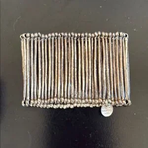 Note that a few of the bars were taken off to fit tighter. However, the cuff stretches. By French designer Philippe Audibert. Silver. Cuff measures about two inches in width. Meant to be a chunky but elegant piece. Will run some silver polish cleaner on it before shipping.