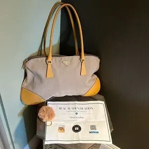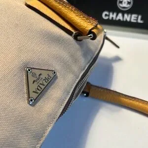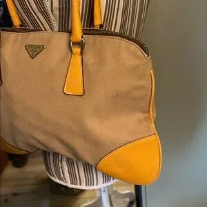 ๐ 1 hour sale. Prada, Tan & brown, leather trim and corners w/ canvas, wโฆ