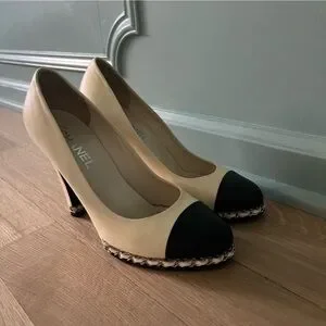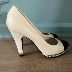 Classic, chic, iconic, CHANEL. These adorable leather pumps will be your new favorites! Perfect for the modern fashionista, these platform pumps feature the classic black cap toe with the iconic chain/leather detailing around the toe. Padded leather insoles make these easy to wear all day. Wear these to work or for play! Retail price is $895.