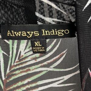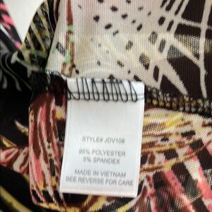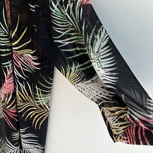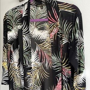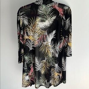 This sheer open front kimono style swim coverup features a bold black and white palm leaf pattern, perfect for a stylish beach look. Its lightweight mesh fabric and flowing tunic length offer comfortable coverage for sunny days by the water. Can be dressed up and worn with non-swim outfits as well. Women’s size XL. Measurements 24” pit to pit, 32” shoulder to hem