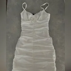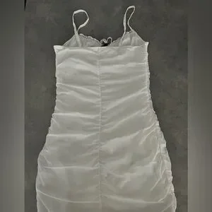 Elegant white midi dress. Features ruched design. Spaghetti straps. Perfect for any occasion.