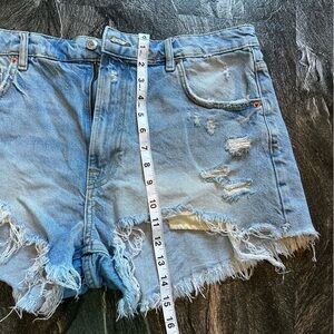 Zara Jean shorts with cute frayed hem. Only worn once! Stretchy and have a long back so your booty is covered. The front is higher so be aware! Pockets show on the legs. True to size. Adorable and feel so high quality. Pockets are a great size! The only "flaw" is a slight impression on the leather tag on the back of the waist band because I hung them to dry after washing them and the hanger left an impression. Cutoffs