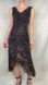 Sue Wong Nocturne beaded sequin sequin silk velvet burnout cowl neck midi slip dress asymmetrical vintage Y2K style slipdress. Black with brown and tan tonal cheetah leopard animal print and dark iridescent beading and sequins. Asymmetric handkerchief hemline. Cowl neckline and draped open back. Fully lined. Silk and rayon blend. Faint deodorant transfer in the underarm area. Gently used preowned condition.