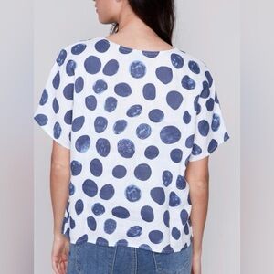 Elevate your style with this chic polka dot top. Featuring a playful blue and white design, it's perfect for any casual outing. Enjoy comfort and fashion in one stylish piece. Linen top new. Pit to pit 18”