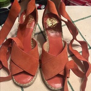 Step out in style with these Vince Camuto espadrille sandals. Featuring a vibrant orange hue, these shoes are perfect for adding a pop of color to any outfit. The wrap-around all suede, outside, leather inside, design offers a chic and secure fit.