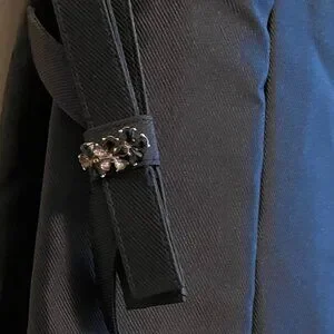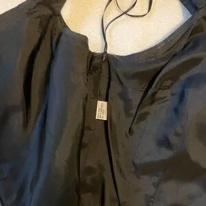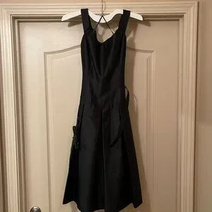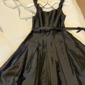 Great little black dress in a classic Audrey Hepburn style. I am the only owner of this 100% silk dress, and I wore it three times from 2005-07. The belt, which is original to the dress, has three size adjustments. Unfortunately, a couple of the "jewels" from the belt have fallen out. Please see the closeup photo of the belt. Also, there is a small snag in the silk on the back of the dress, which is also pictured in the attached photos. Otherwise the dress is in excellent preloved condition and the quality that one expects from Teri Jon by Rickie Freeman.
